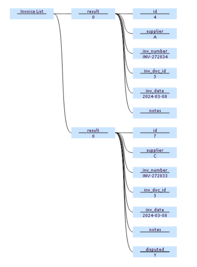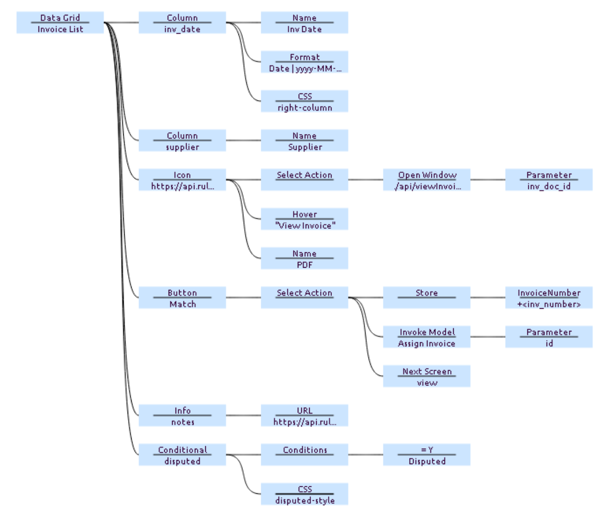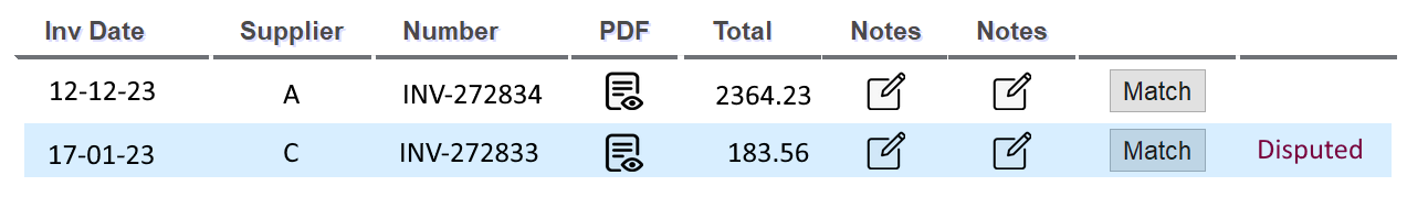 A Button displaying the word “Match”, when clicked, the current "inv_number" will be stored and the model “Assign Invoice” will be invoked passing the Parameter of “id” from the current line. Once invoked the screen will move to the “view" screen.